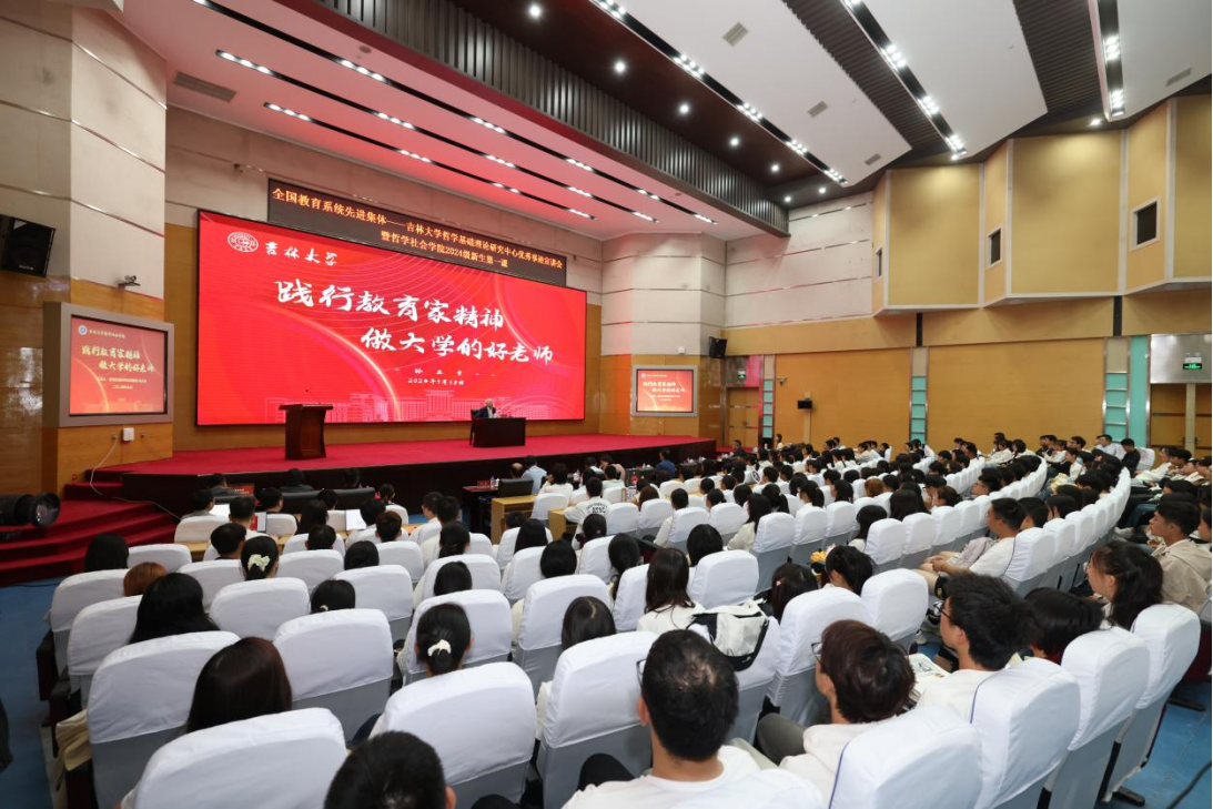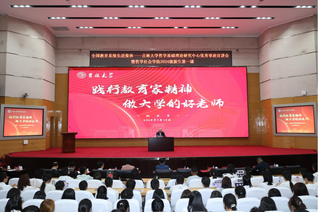 为深入学习贯彻全国教育大会精神,充分发挥“全国教育系统先进集体”——吉林大学哲学基础理论研究中心优秀事迹对学院师生的凝聚力、团结力和引领力,9月18日在东荣报告厅,哲学社会科学资深教授孙正聿以“践行教育家精神,做大学的好老师”为题,为哲学社会学院2024级新同学讲授第一课,带领学院师生深入学习体会教育家精神与教育的本质,引导学院师生赓续优良治学传统,打好教书育人、成长成才的“基本功”。