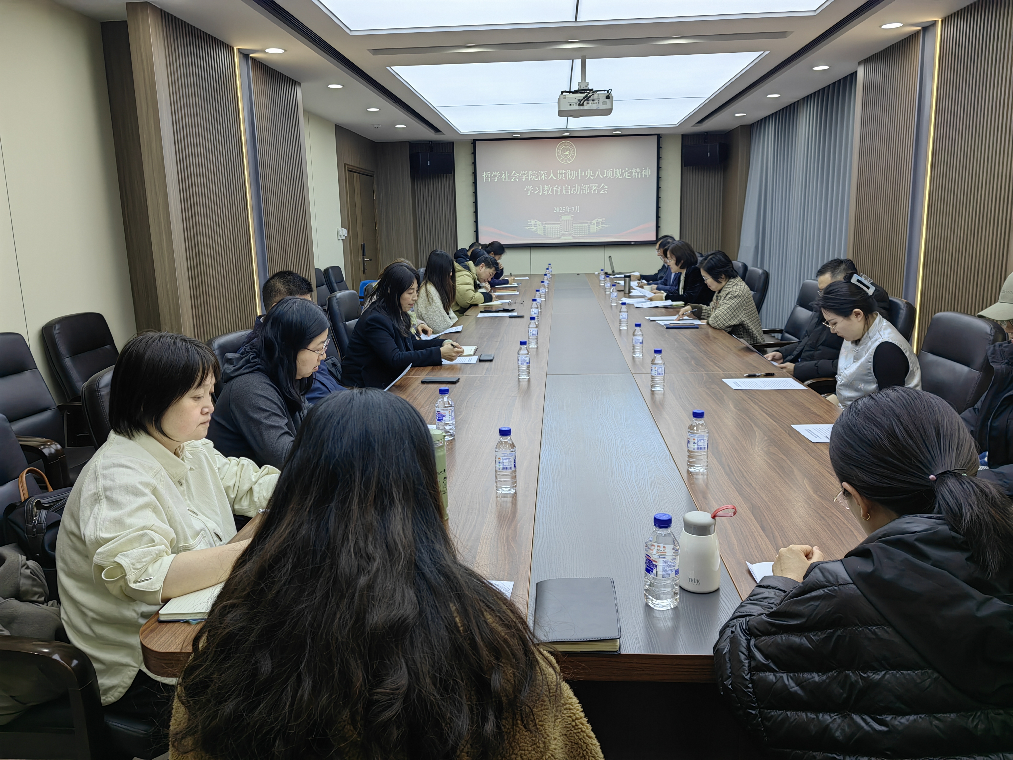 会上,与会人员审议并通过了《哲学社会学院关于深入贯彻中央八项规定精神学习教育的实施方案》。党委副书记、纪委书记赵洁传达了姜治莹书记在学校深入贯彻中央八项规定精神学习教育启动部署会上的讲话精神。随后,党委书记张晓萌就学院落实学习教育提出了明确要求。一是要提高政治站位,充分认识开展学习教育的重要意义。此次学习教育是拥护“两个确立”、做到“两个维护”的具体行动,是扛起全面从严治党重大责任的具体行动,更是推动学院事业高质量发展的具体行动。二是要明确工作重点,牢牢把握开展学习教育的重要任务。坚持聚焦主题,紧盯关键环节,突出“细”“学”“深”“实”,扎实推进学习教育工作。三是要以高标准,全面确保学习教育取得实效。要压紧压实责任,加强统筹协调,强化宣传引导。张晓萌书记号召全院师生党员要以优良的作风、扎实的工作,为打造创新活力迸发、学术根基深厚、学科体系完备的哲学社会学院贡献力量,助力学院加速发展。