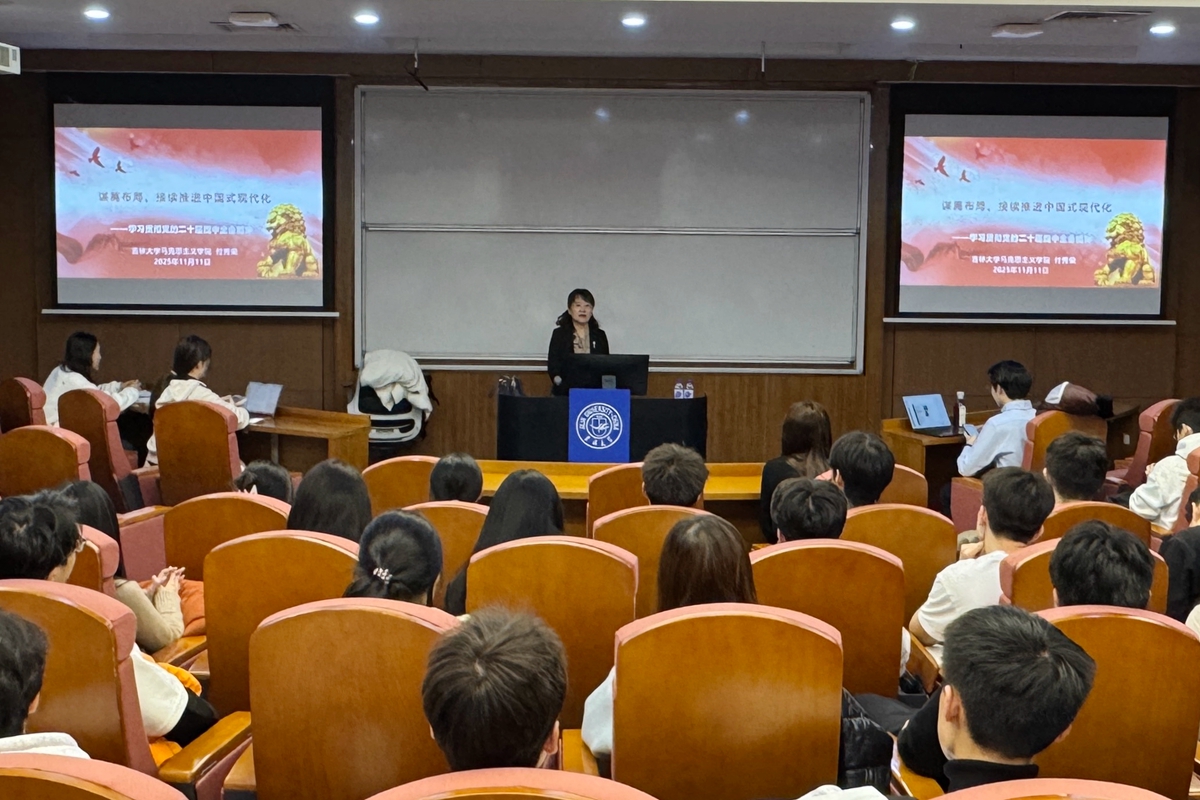 【供稿:团委】日前,吉林大学学习贯彻党的二十届四中全会精神专家宣讲团成员、马克思主义学院教授付秀荣走进“青马工程”培训班,以《谋篇布局 接续推进中国式现代化——学习贯彻党的二十届四中全会精神》为题,聚焦“青马工程”学员如何学习党的二十届四中全会精神展开宣讲。宣讲活动在中心校区逸夫教学楼第六阶梯教室举行,吉林大学“青马工程”培训班(五青班)团支部书记范浩然主持本次活动。